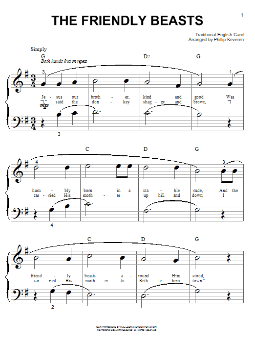 Download or print Traditional English Carol The Friendly Beasts (arr. Phillip Keveren) sheet music, chords and digital score arranged for Big Note Piano. This Children score includes 2 page(s).
