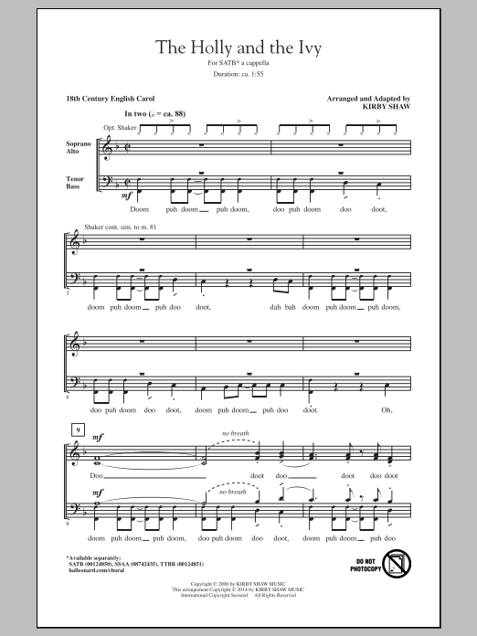 Download or print Kirby Shaw The Holly And The Ivy sheet music, chords and digital score arranged for SATB Choir. This Christmas score includes 7 page(s).