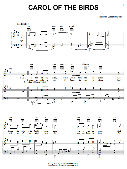 Download or print Traditional Catalonian Carol Carol Of The Birds sheet music, chords and digital score arranged for Lead Sheet / Fake Book. This Christmas score includes 1 page(s).