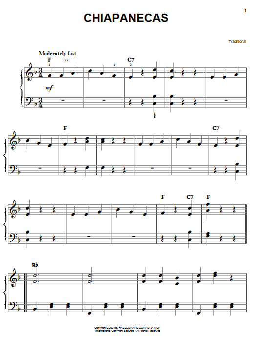 Download or print Traditional Chiapanecas sheet music, chords and digital score arranged for Piano, Vocal & Guitar Chords (Right-Hand Melody). This Children score includes 5 page(s).