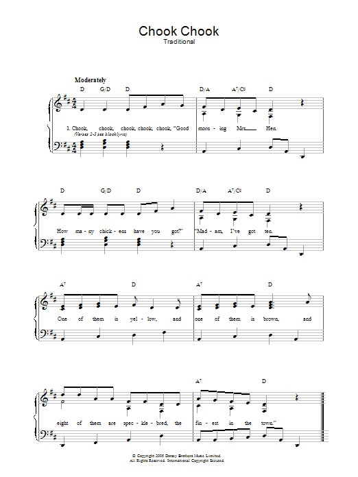 Download or print Traditional Chook Chook sheet music, chords and digital score arranged for Piano, Vocal & Guitar Chords. This Children score includes 2 page(s).