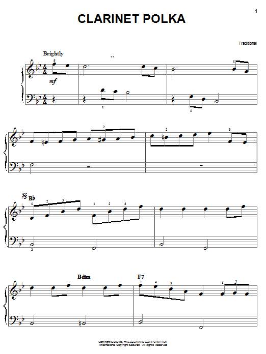 Download or print Traditional Clarinet Polka sheet music, chords and digital score arranged for Easy Piano. This Traditional score includes 4 page(s).