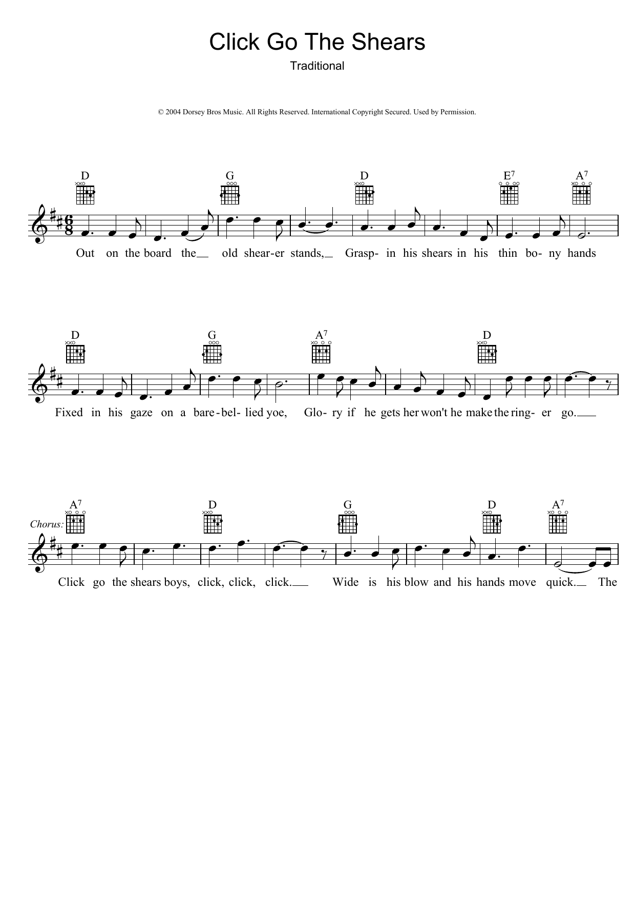 Download or print Traditional Click Go The Shears sheet music, chords and digital score arranged for Lead Sheet / Fake Book. This Folk score includes 2 page(s).