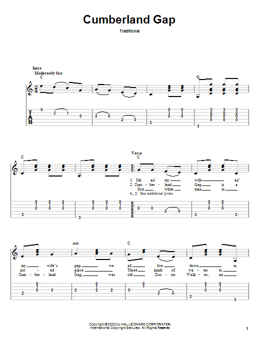 Download or print Traditional Cumberland Gap sheet music, chords and digital score arranged for Solo Guitar. This Country score includes 2 page(s).