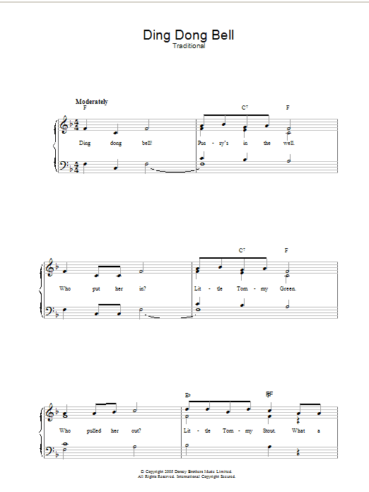 Download or print Traditional Ding Dong Bell sheet music, chords and digital score arranged for Piano, Vocal & Guitar Chords. This Children score includes 2 page(s).