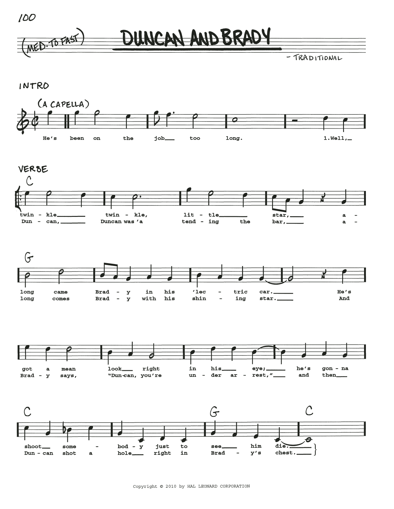 Download or print Traditional Duncan And Brady sheet music, chords and digital score arranged for Real Book – Melody, Lyrics & Chords. This Jazz score includes 2 page(s).