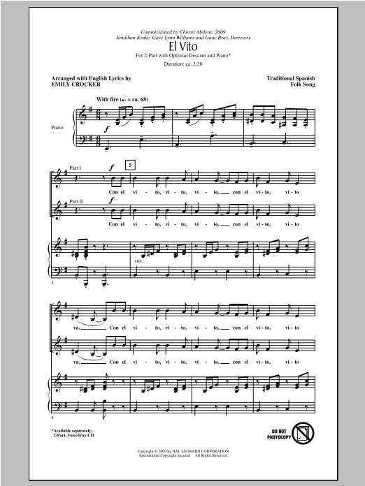 Download or print Traditional Spanish Folksong El Vito (arr. Emily Crocker) sheet music, chords and digital score arranged for 2-Part Choir. This Folk score includes 11 page(s).