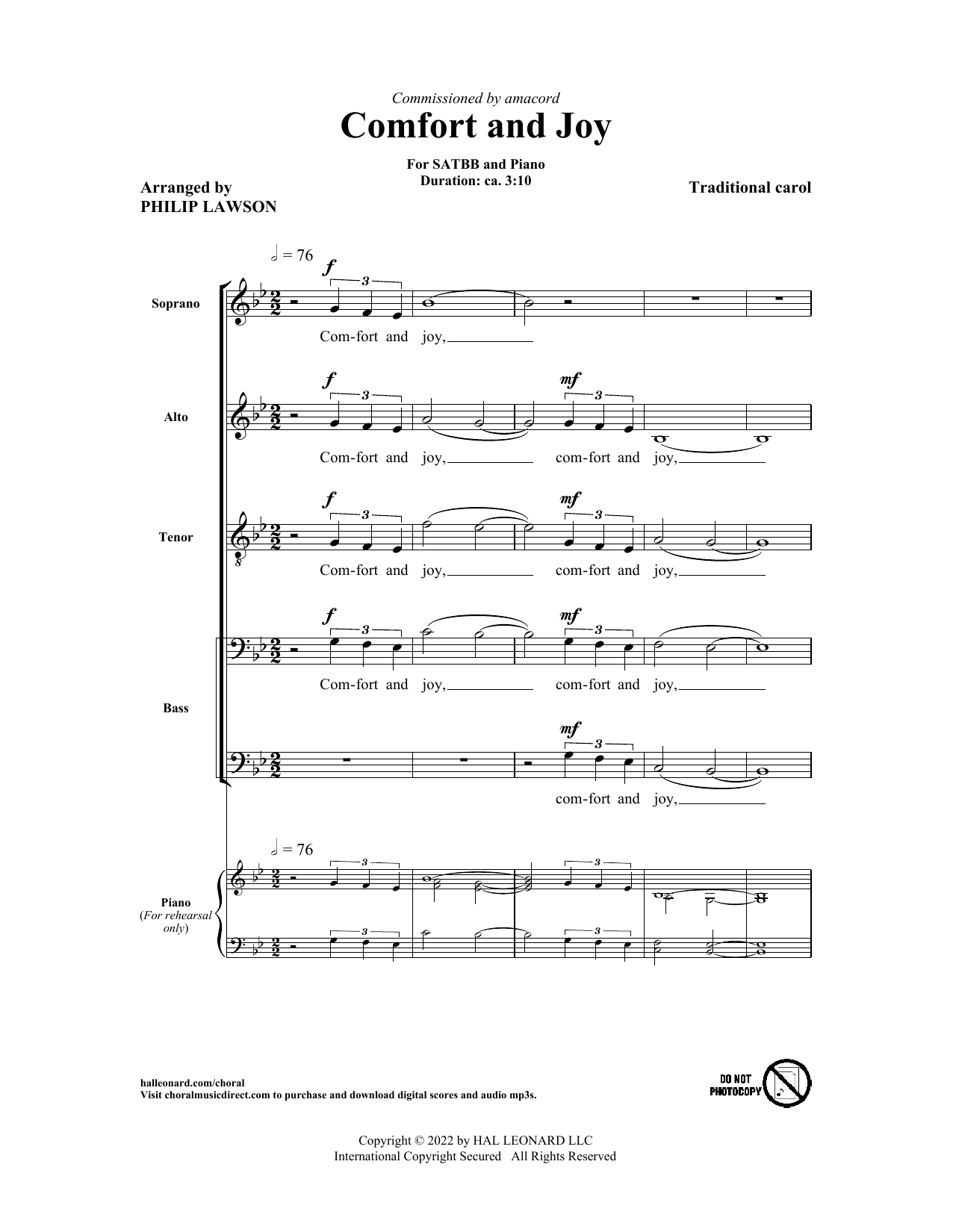 Download or print Traditional English Carol Comfort And Joy (arr. Philip Lawson) sheet music, chords and digital score arranged for SATBB Choir. This Holiday score includes 15 page(s).