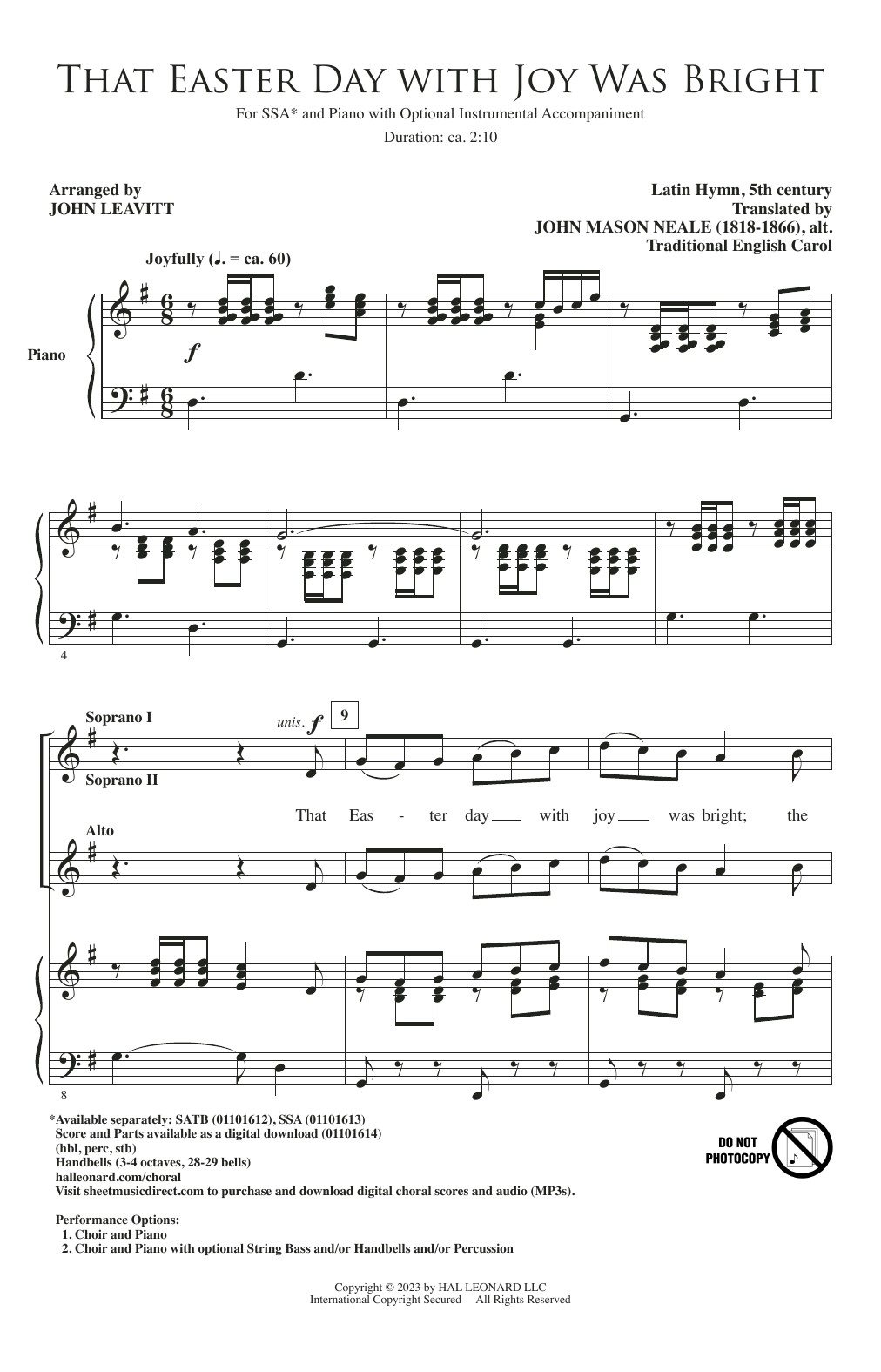 Download or print Traditional English Carol That Easter Day With Joy Was Bright (arr. John Leavitt) sheet music, chords and digital score arranged for SSA Choir. This Easter score includes 7 page(s).