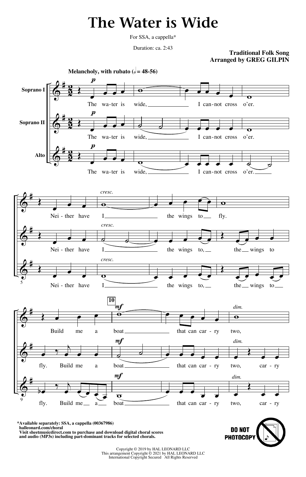 Download or print Traditional Folk Song The Water Is Wide (arr. Greg Gilpin) sheet music, chords and digital score arranged for SSA Choir. This Concert score includes 5 page(s).