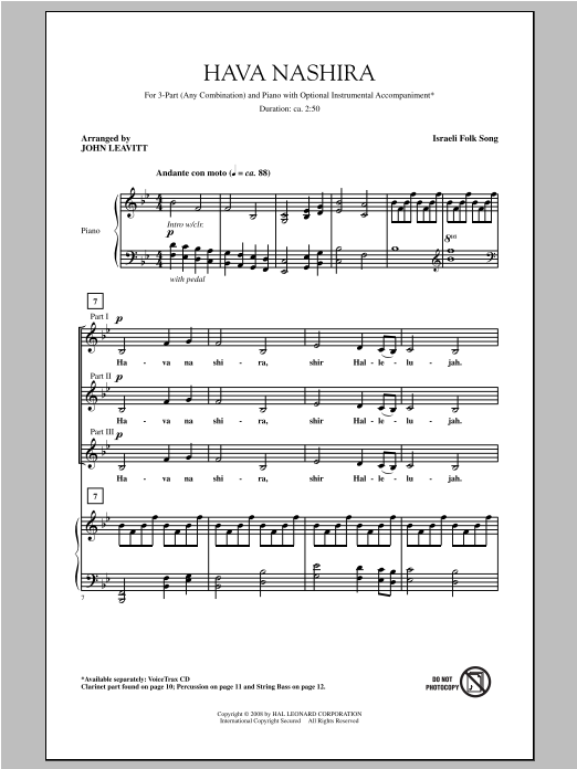 Download or print John Leavitt Hava Nashira sheet music, chords and digital score arranged for 3-Part Mixed Choir. This Concert score includes 11 page(s).