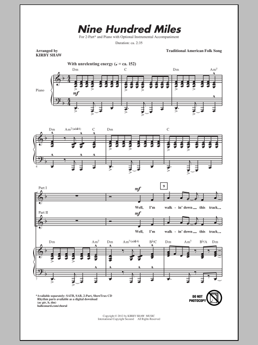 Download or print Kirby Shaw Nine Hundred Miles sheet music, chords and digital score arranged for 2-Part Choir. This Folk score includes 11 page(s).