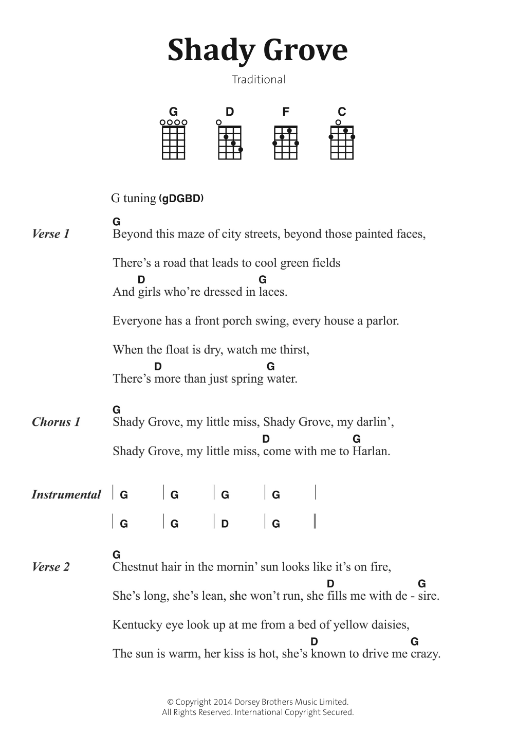 Download or print Traditional Folksong Shady Grove sheet music, chords and digital score arranged for Banjo Chords/Lyrics. This Folk score includes 2 page(s).