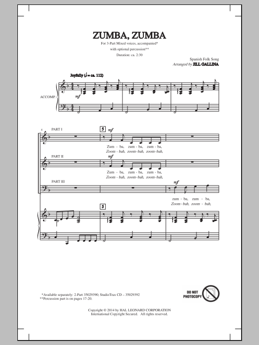 Download or print Jill Gallina Zumba, Zumba sheet music, chords and digital score arranged for 3-Part Mixed Choir. This Folk score includes 9 page(s).