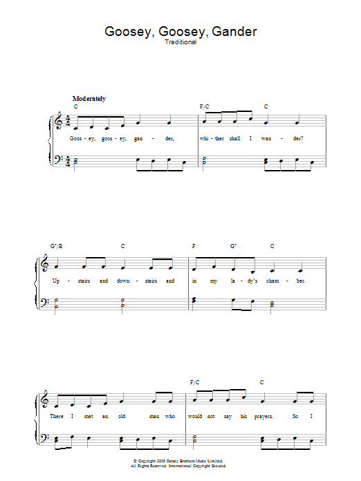 Download or print Traditional Goosey Goosey Gander sheet music, chords and digital score arranged for Piano, Vocal & Guitar Chords. This Children score includes 2 page(s).