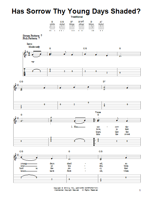 Download or print Traditional Has Sorrow Thy Young Days Shaded? sheet music, chords and digital score arranged for Easy Guitar Tab. This Folk score includes 3 page(s).