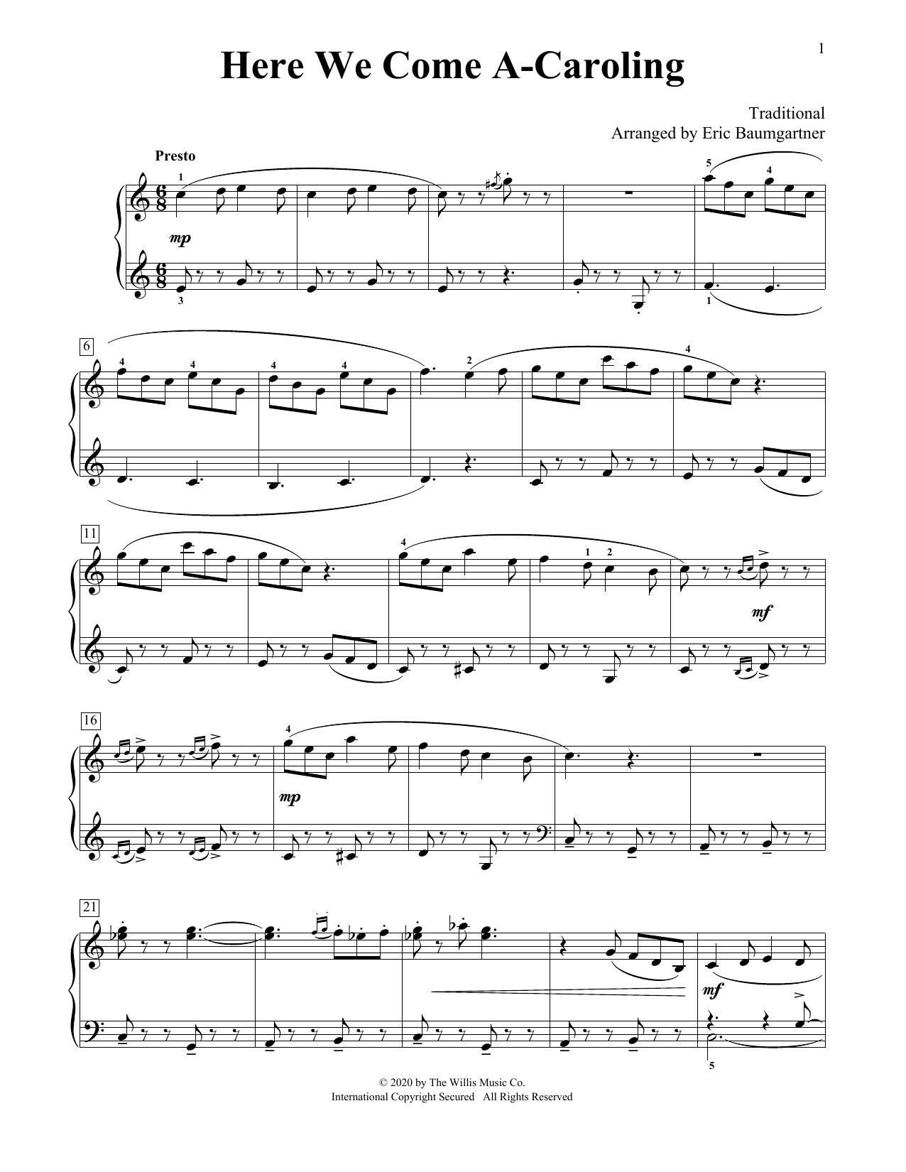 Download or print Traditional Here We Come A-Caroling [Jazz version] (arr. Eric Baumgartner) sheet music, chords and digital score arranged for Educational Piano. This Jazz score includes 2 page(s).