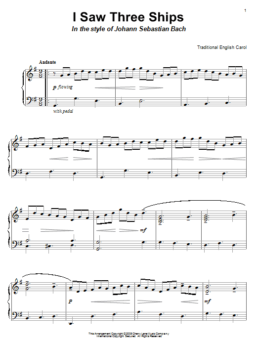 Download or print Traditional English Carol I Saw Three Ships (in the style of J.S. Bach) sheet music, chords and digital score arranged for Piano Solo. This Christmas score includes 2 page(s).