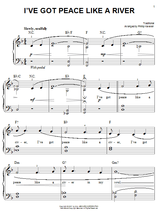 Download or print Traditional I've Got Peace Like A River (arr. Phillip Keveren) sheet music, chords and digital score arranged for Piano Solo. This Christian score includes 3 page(s).