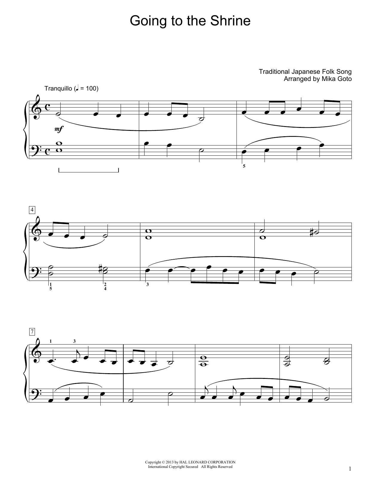 Download or print Traditional Japanese Folk Song Going To The Shrine (arr. Mika Goto) sheet music, chords and digital score arranged for Educational Piano. This Multicultural score includes 2 page(s).