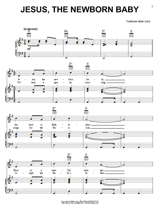 Download or print Traditional Jesus, The Newborn Baby sheet music, chords and digital score arranged for Piano, Vocal & Guitar Chords (Right-Hand Melody). This Christmas score includes 2 page(s).