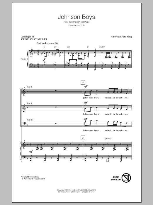 Download or print Cristi Cary Miller Johnson Boys sheet music, chords and digital score arranged for 3-Part Mixed Choir. This Children score includes 15 page(s).