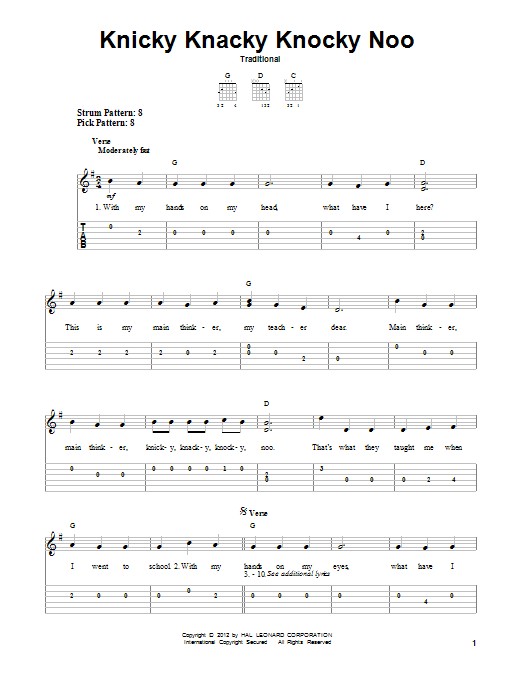 Download or print Traditional Knicky Knacky Knocky Noo sheet music, chords and digital score arranged for Easy Guitar Tab. This Children score includes 2 page(s).