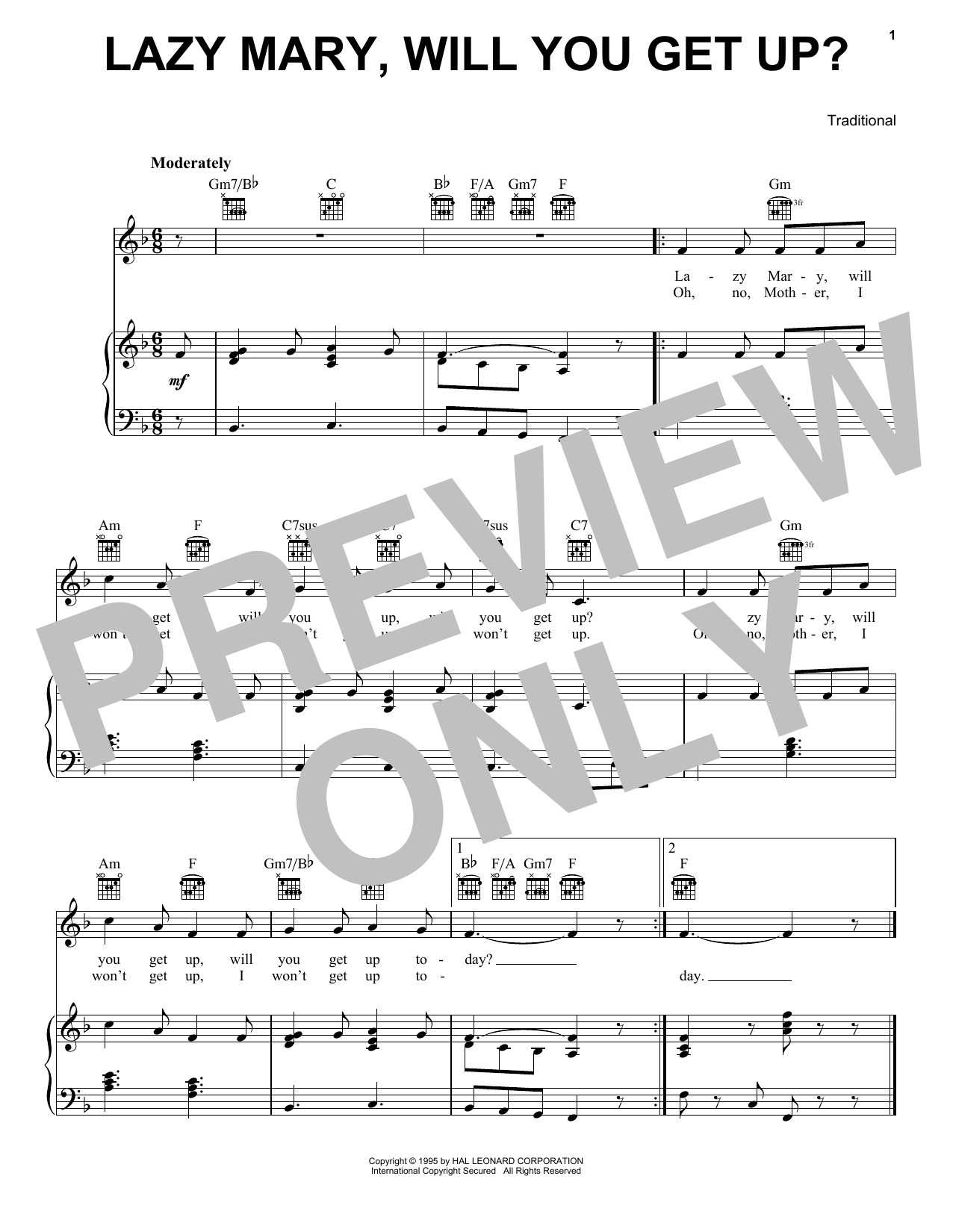 Download or print Traditional Lazy Mary, Will You Get Up? sheet music, chords and digital score arranged for Piano, Vocal & Guitar Chords (Right-Hand Melody). This Children score includes 1 page(s).