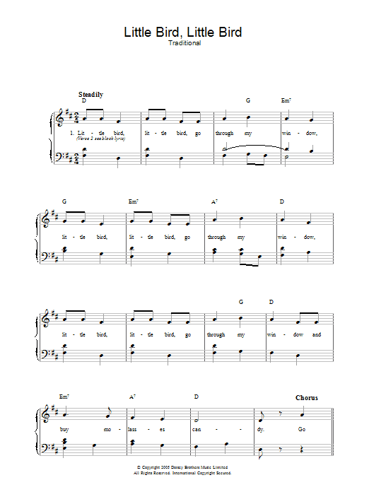 Download or print Traditional Little Bird, Little Bird sheet music, chords and digital score arranged for Piano, Vocal & Guitar Chords. This Children score includes 2 page(s).