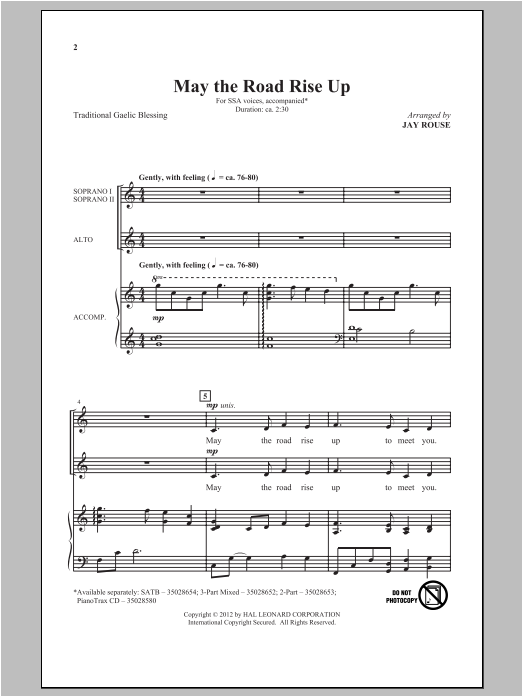 Download or print Jay Rouse May The Road Rise Up sheet music, chords and digital score arranged for 3-Part Mixed Choir. This Concert score includes 7 page(s).