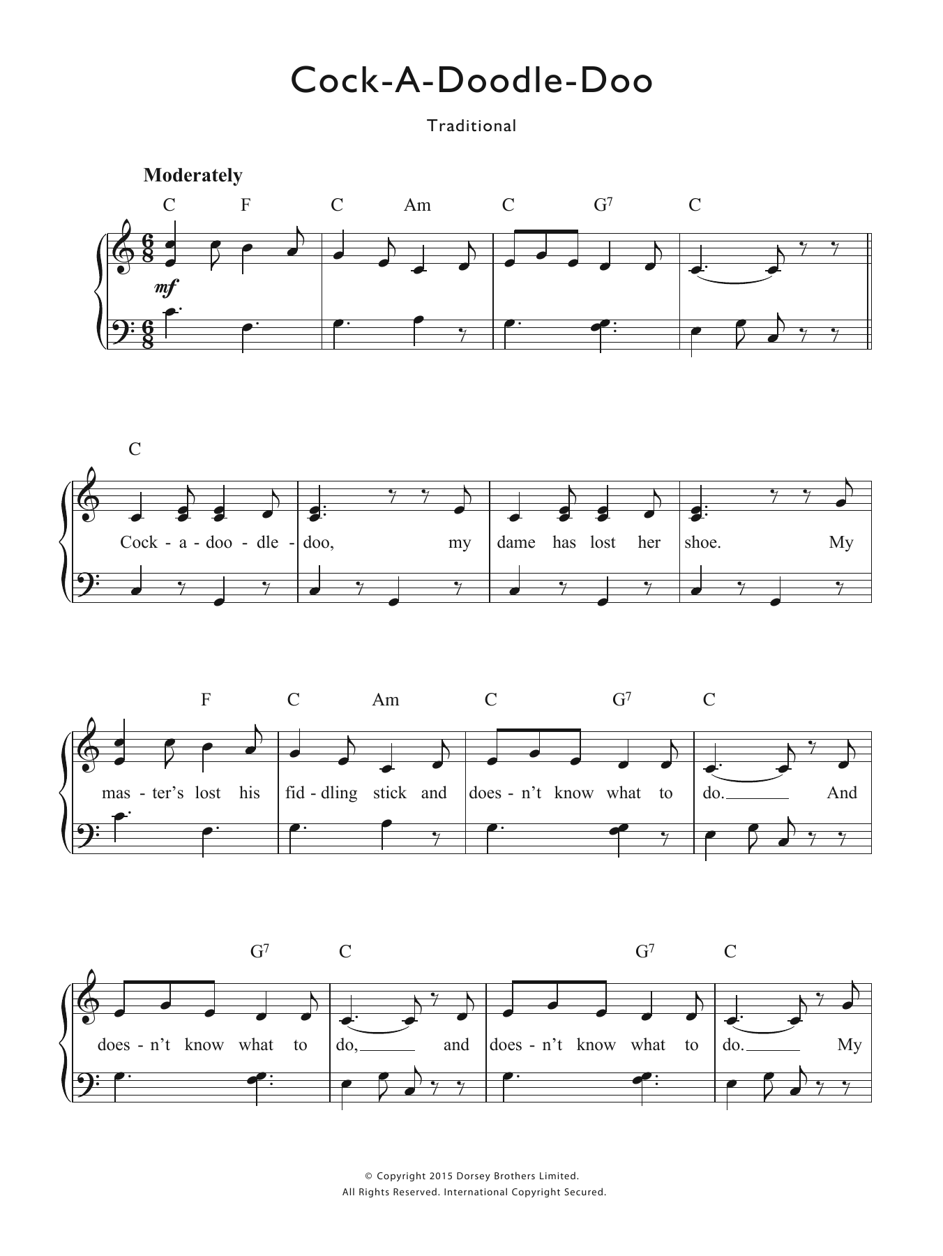Download or print Traditional Nursery Rhyme Cock-A-Doodle-Doo sheet music, chords and digital score arranged for Piano & Vocal. This Children score includes 2 page(s).