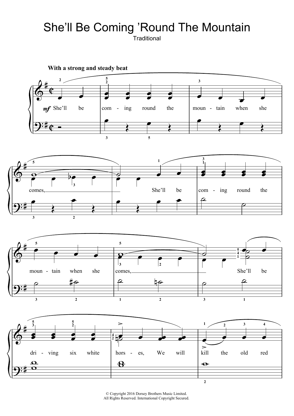 Download or print Traditional Nursery Rhyme She'll Be Coming 'Round The Mountain sheet music, chords and digital score arranged for Easy Piano. This Children score includes 2 page(s).