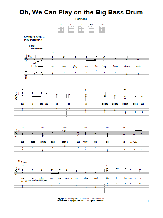 Download or print Traditional Oh, We Can Play On The Big Bass Drum sheet music, chords and digital score arranged for Easy Guitar Tab. This Children score includes 2 page(s).