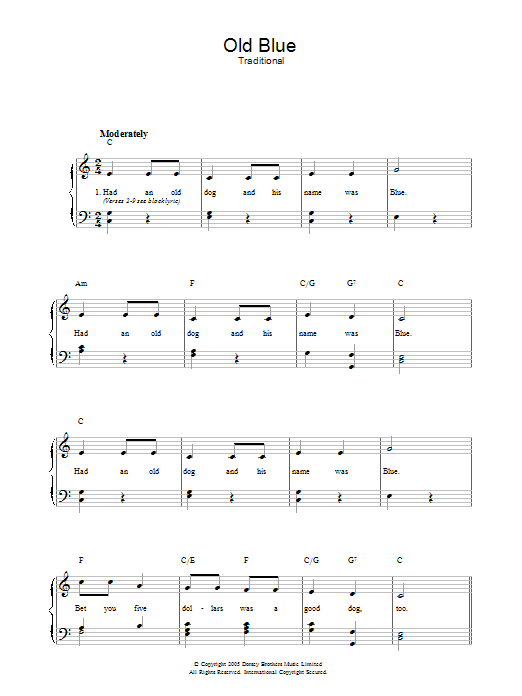 Download or print Traditional Old Blue sheet music, chords and digital score arranged for Piano, Vocal & Guitar Chords. This Children score includes 2 page(s).