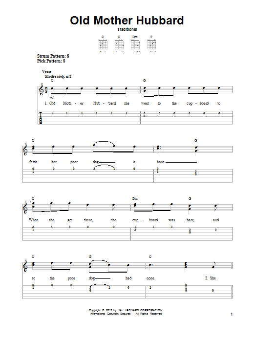 Download or print Traditional Old Mother Hubbard sheet music, chords and digital score arranged for Easy Guitar Tab. This Children score includes 2 page(s).