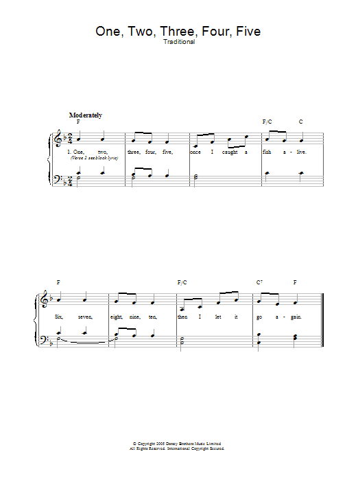 Download or print Traditional One Two Three Four Five sheet music, chords and digital score arranged for Piano, Vocal & Guitar Chords. This Children score includes 2 page(s).