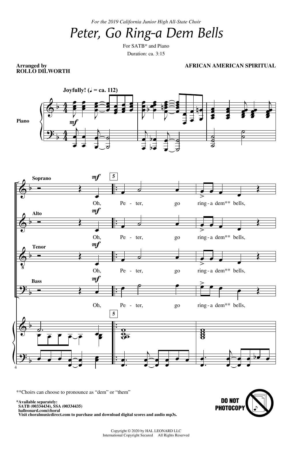 Download or print Traditional Peter Go Ring-A Dem Bells (arr. Rollo Dilworth) sheet music, chords and digital score arranged for SSA Choir. This Concert score includes 11 page(s).