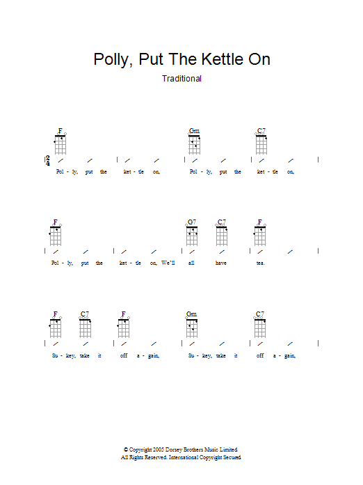 Download or print Traditional Polly Put The Kettle On sheet music, chords and digital score arranged for Piano, Vocal & Guitar Chords (Right-Hand Melody). This Children score includes 1 page(s).