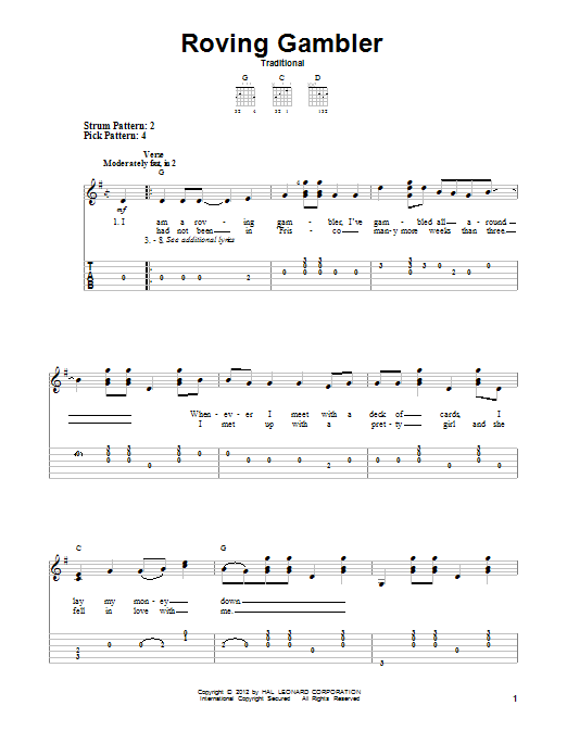 Download or print Traditional Roving Gambler sheet music, chords and digital score arranged for Easy Guitar Tab. This Country score includes 2 page(s).