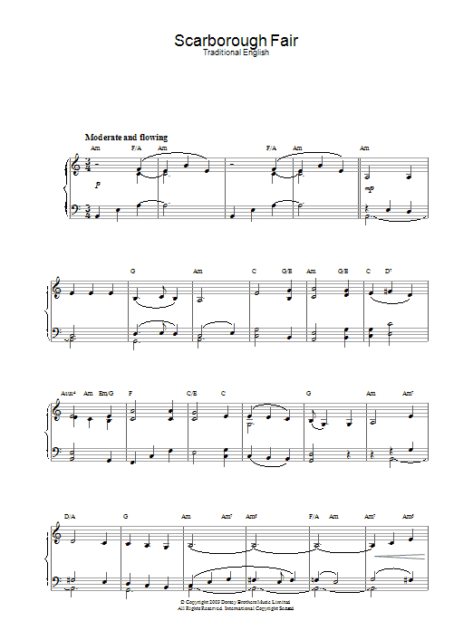 Download or print Traditional English Ballad Scarborough Fair sheet music, chords and digital score arranged for Piano, Vocal & Guitar Chords (Right-Hand Melody). This Folk score includes 2 page(s).