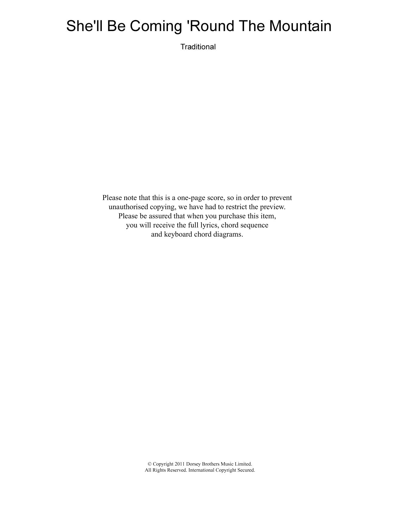 Download or print Traditional She'll Be Coming 'Round The Mountain sheet music, chords and digital score arranged for Piano Chords/Lyrics. This Children score includes 2 page(s).