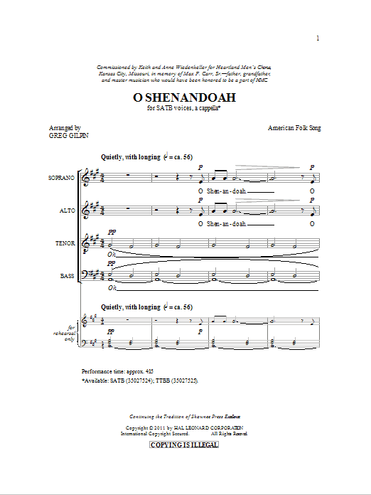 Download or print Greg Gilpin Shenandoah sheet music, chords and digital score arranged for SATB Choir. This Folk score includes 9 page(s).