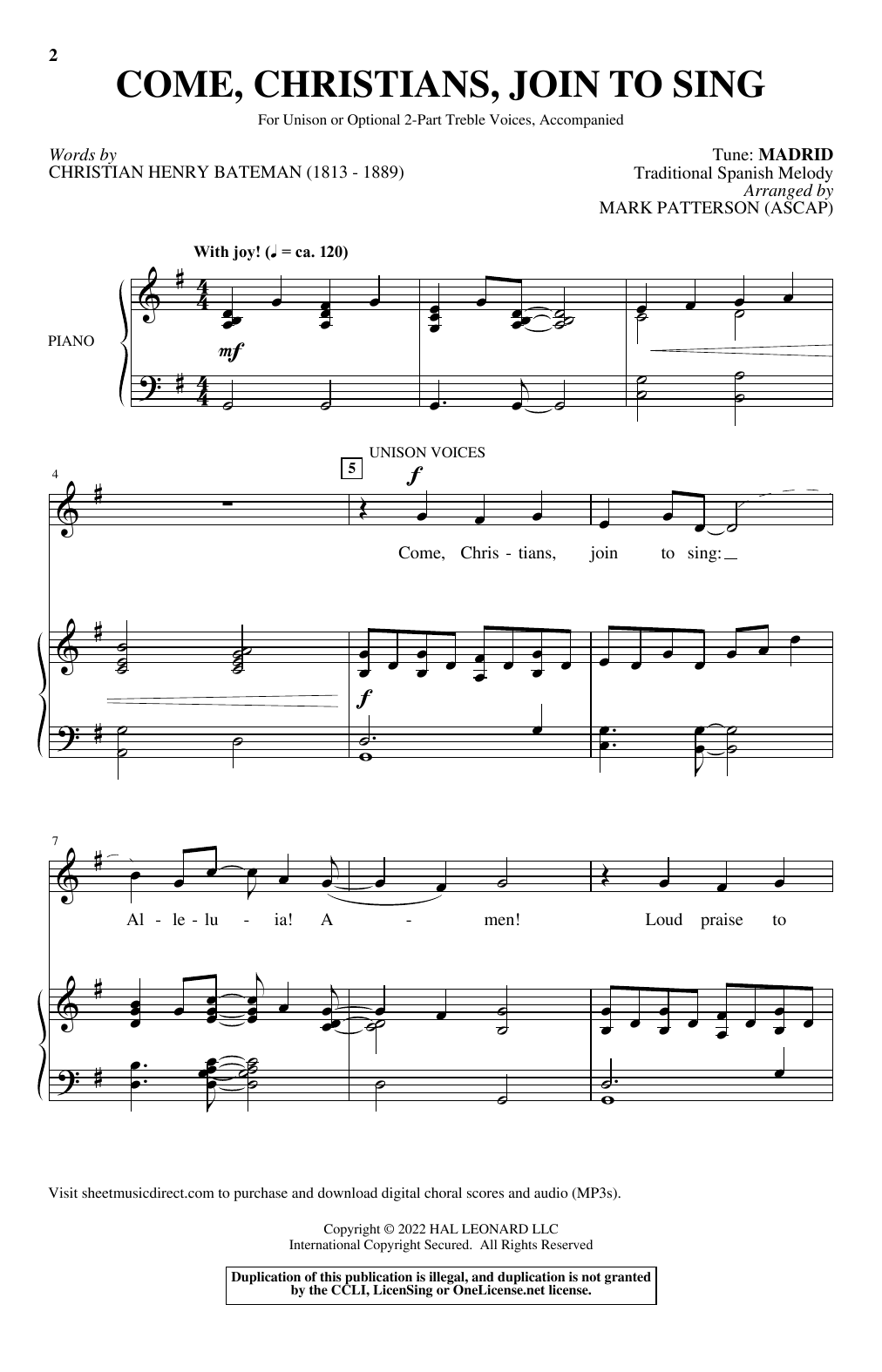 Download or print Traditional Spanish Melody Come, Christians, Join To Sing (arr. Mark Patterson) sheet music, chords and digital score arranged for Unison Choir. This Children score includes 6 page(s).