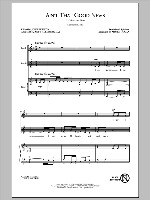 Download or print Moses Hogan Ain't That Good News sheet music, chords and digital score arranged for 3-Part Mixed Choir. This Concert score includes 11 page(s).