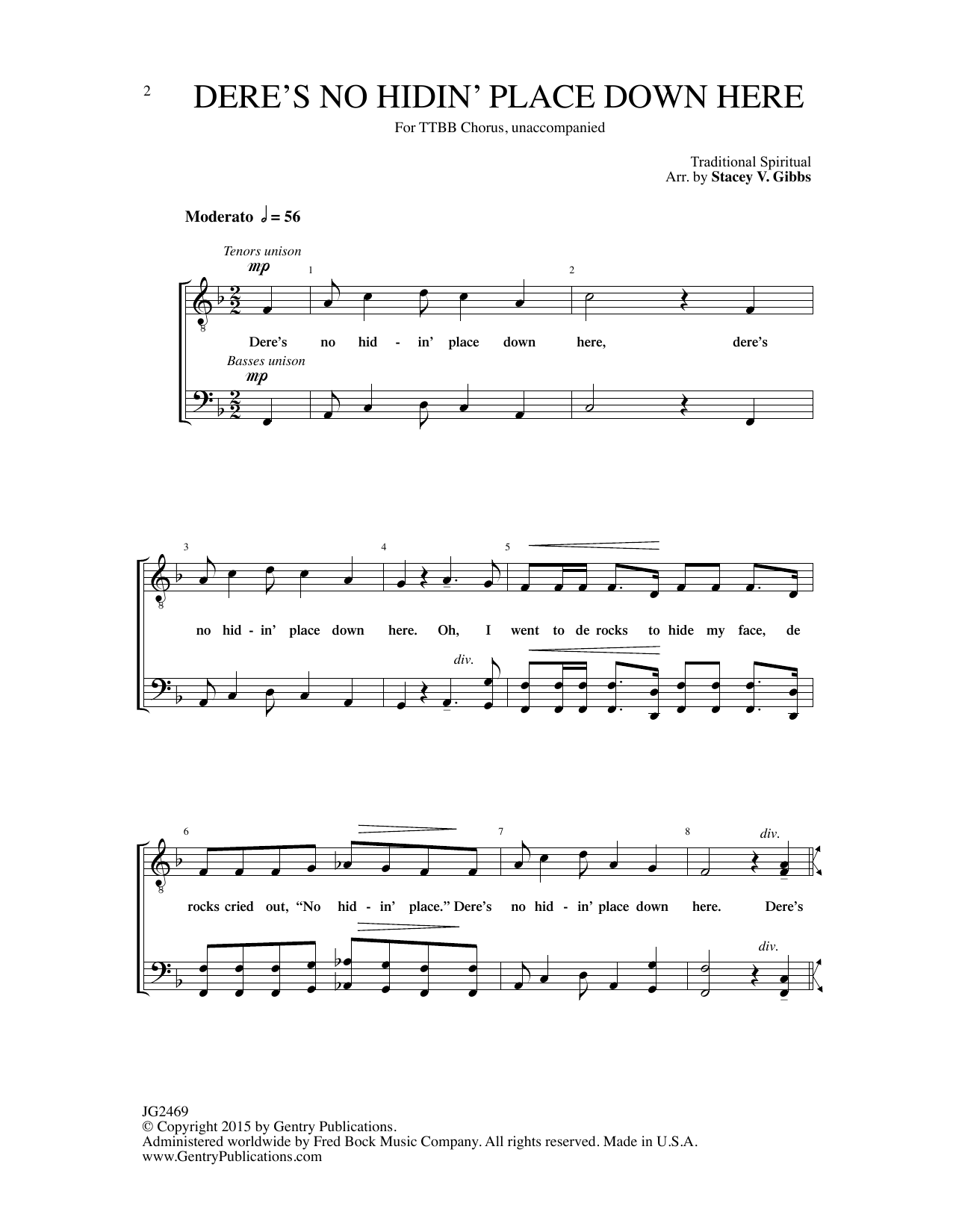 Download or print Traditional Spiritual Dere's No Hidin' Place Down Here (arr. Stacey V. Gibbs) sheet music, chords and digital score arranged for TTBB Choir. This Concert score includes 7 page(s).