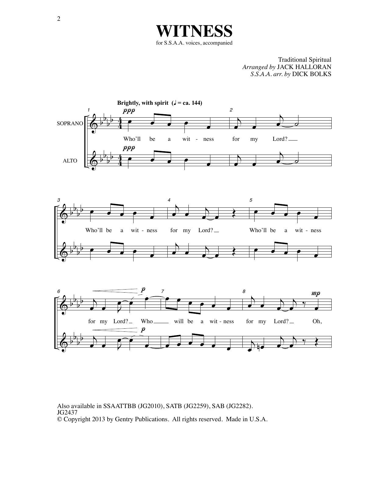 Download or print Traditional Spiritual Witness (arr. Dick Bolks) sheet music, chords and digital score arranged for SSA Choir. This Concert score includes 10 page(s).