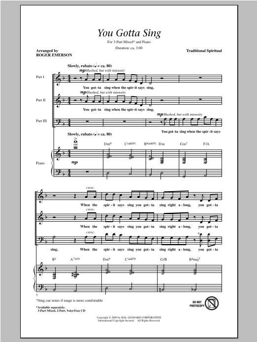 Download or print Roger Emerson You Gotta Sing sheet music, chords and digital score arranged for 3-Part Mixed Choir. This Concert score includes 11 page(s).