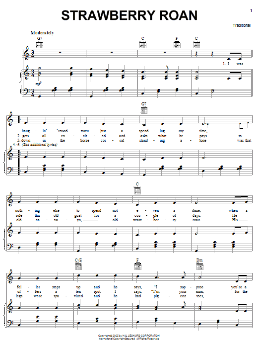 Download or print Traditional Strawberry Roan sheet music, chords and digital score arranged for Piano, Vocal & Guitar Chords (Right-Hand Melody). This Country score includes 4 page(s).