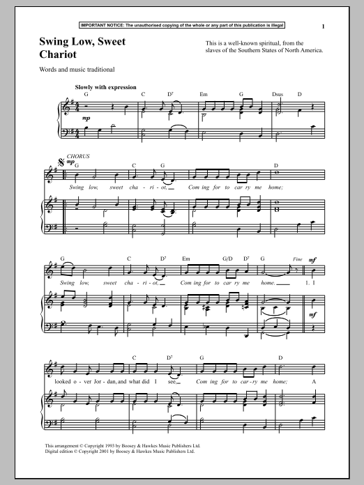 Download or print Traditional Swing Low, Sweet Chariot sheet music, chords and digital score arranged for Piano & Vocal. This Traditional score includes 2 page(s).