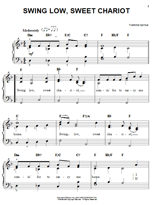 Download or print Traditional Spiritual Swing Low, Sweet Chariot sheet music, chords and digital score arranged for Easy Piano. This Inspirational score includes 2 page(s).
